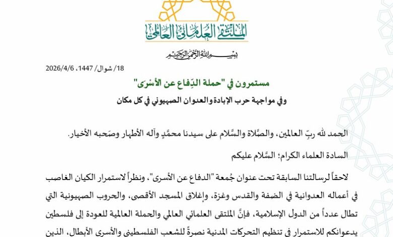 لاحقاً لرسالتنا السابقة تحت عنوان جُمعة “الدفاع عن الأسرى”، ونظراً لاستمرار الكيان الغاصب في أعماله العدوانية في الضفة والقدس وغزة، وإغلاق المسجد الأقصى، والحروب الصهيونية التي تطال عدداً من الدول الإسلامية، فإنَّ الملتقى العلمائي العالمي والحملة العالمية للعودة إلى فلسطين يدعوانكم للاستمرار في تنظيم التحركات المدنية نصرةً للشعب الفلسطيني والأسرى الأبطال، الذين ينتظرون منكم مواقف قوية إلى جانبهم.